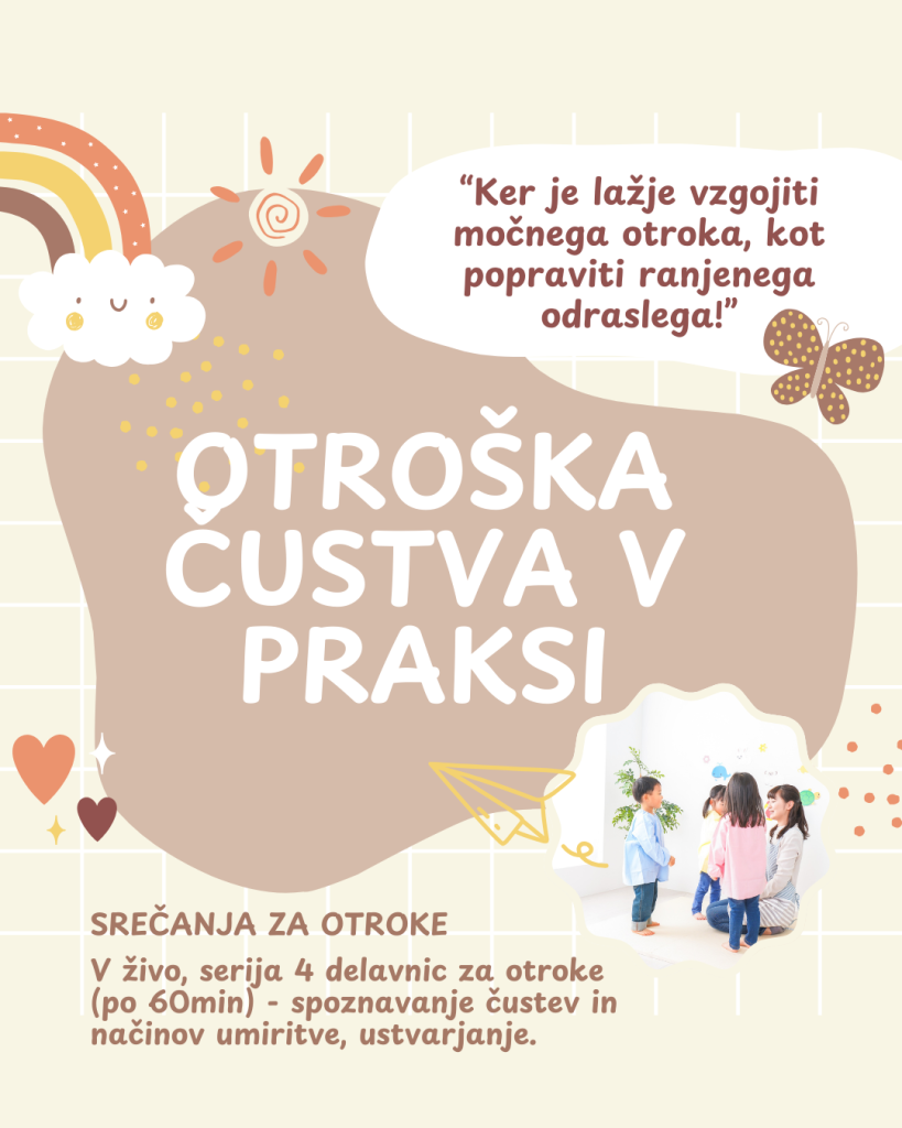 je sklop izkustvenih delavnic za otroke: OTROŠKA ČUSTVA V PRAKSI, kjer bom skupaj z otroki raziskovala čustva in načine umiritve.